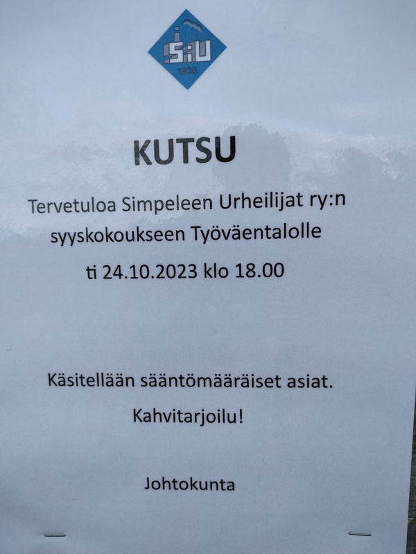 Tervetuloa syyskokouksen 24.10 tiistaina Klo 18.00 Työväentalolle.